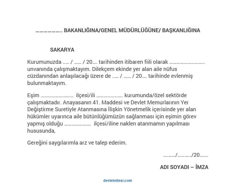 657 sayılı devlet memurları kanununun 72. Maddesi gereğince, devlet memurlarının yer değiştirme hususu ile atanmasına ilişkin yönetmelikler göz önüne alınarak belirtilen mevzuatlar uyarınca … sebebiyle naklen atanmamın İstanbul iline yapılmasını istemekteyim.